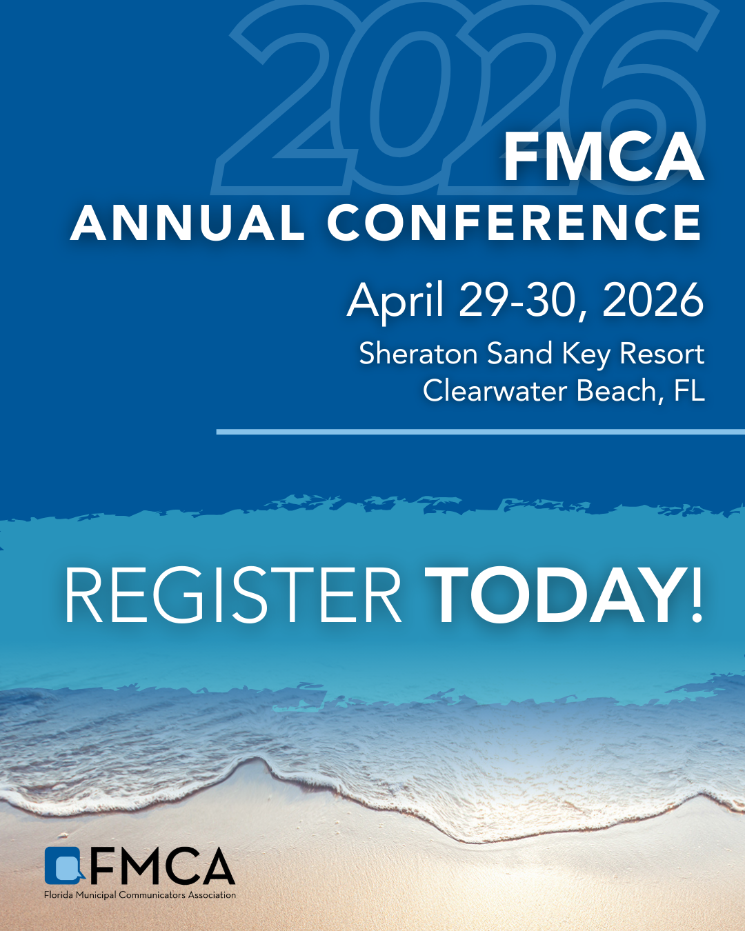 The Florida Municipal Communicators Association Annual Conference will be held April 29-30, 2026, at the Clearwater Beach Sheraton Resort on Sand Key in Clearwater Beach, Florida. This fast-paced conference is designed for local government communications and public information professionals to learn, share and connect.